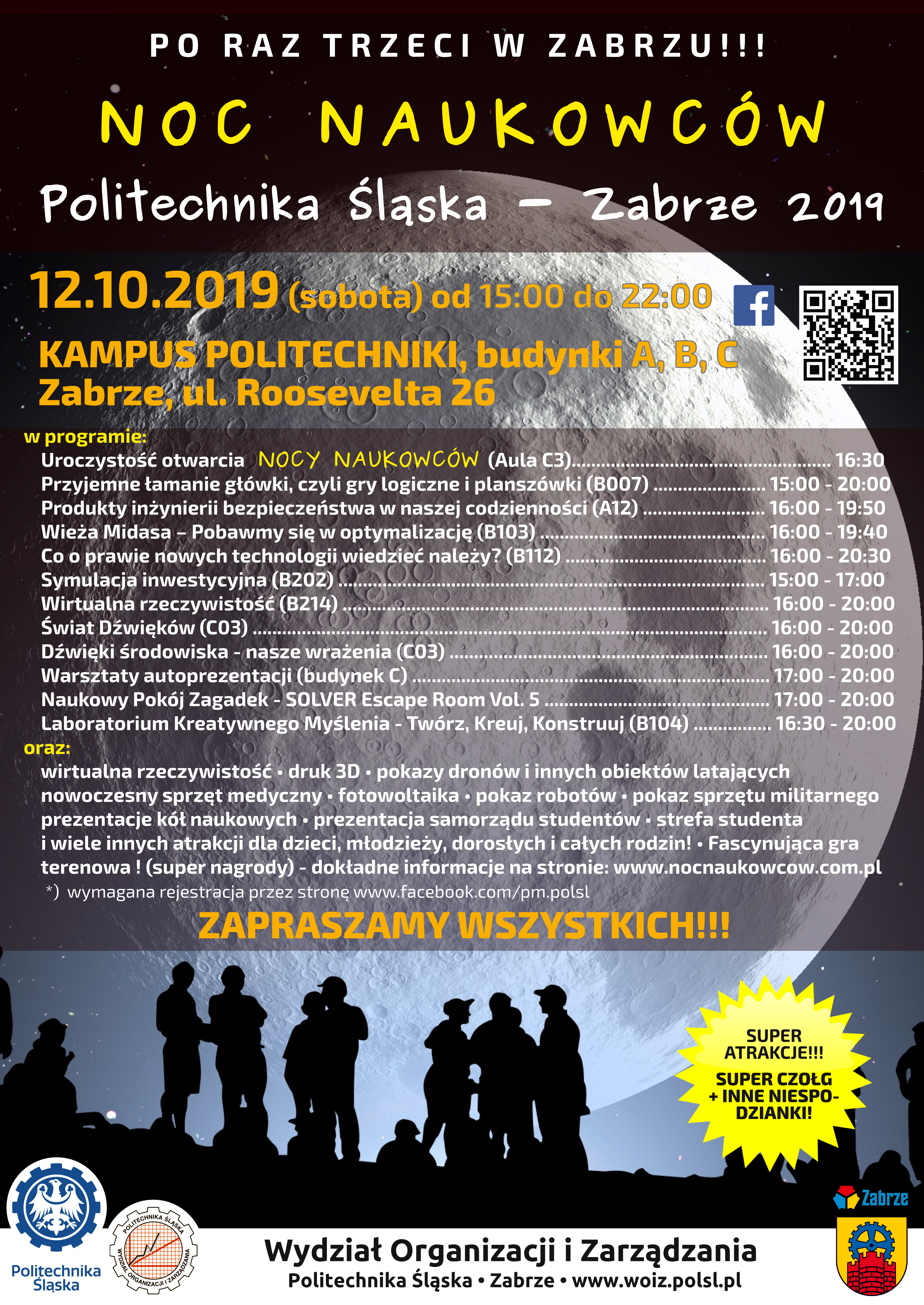 Noc Naukowców Politechniki Śląskiej potrwa od godziny 15:00 do godziny 21:00. W Zabrzu wielkie otwarcie zaplanowano w kampusie PŚl przy ul. Roosevelta 26 na godzinę 16:30.