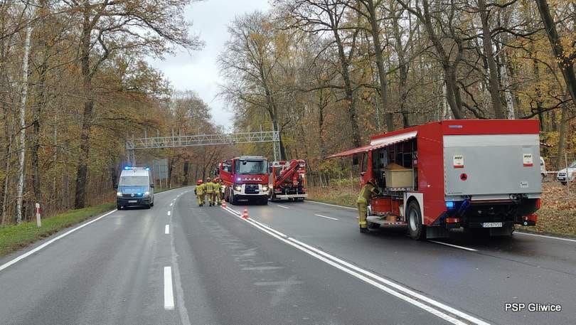 – O godzinie 6:29 Dyżurny Stanowiska Kierowania Komendanta Miejskiego Państwowej Straży Pożarnej w Gliwicach otrzymał zgłoszenie o przewróceniu się zestawu ciągnika siodłowego z cysterną na drodze krajowej nr 88, w kierunku Zabrza – relacjonuje PSP Gliwice. – Pojazdem podróżowała jedna osoba, która w momencie przyjazdu straży pożarnej była już pod opieką zespołu ratownictwa medycznego. Decyzją ratowników osoba ta została przetransportowana do szpitala. Po rozpoznaniu ustalono, że cysterna przewozi chlorek benzoilu, jednak nie doszło do jej uszkodzenia – dodaje straż pożarna.