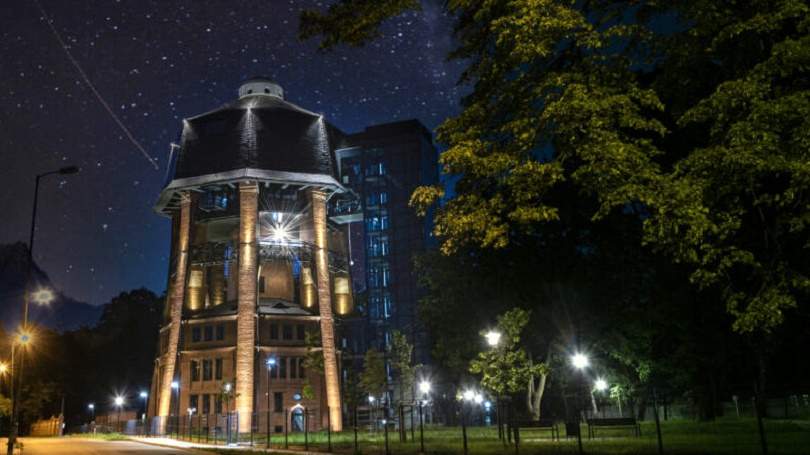 Wieża Ciśnień przy ul. Zamoyskiego powstała w 1909 r. jako element miejskiej sieci wodociągowej. Została zaprojektowana przez architekta Augusta Kinda i radcę budowlanego Friedricha Loose. Ma 46 metrów wysokości i 23,3 metra średnicy. Jej zasadniczą konstrukcję stanowi osiem filarów na planie ośmioboku foremnego oraz filar centralny. Pod mansardowym dachem znajdował się zbiornik na wodę, który w ostatnich latach został zdemontowany. Dolną część obiektu stanowią trzy kondygnacje użytkowe, na których mieściły się mieszkania i biura.