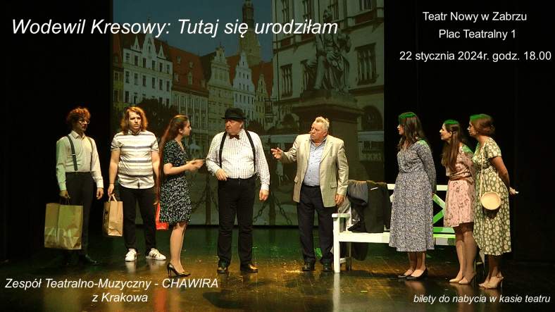 W Teatrze Nowym w Zabrzu odbędzie się kresowy wodewil pt. “Tutaj się urodziłam” w wykonaniu zespołu teatralno-muzycznego “Chawira” z Krakowa. Wydarzenie odbędzie się w poniedziałek, 22 stycznia, rozpoczęcie o godzinie 18:00.