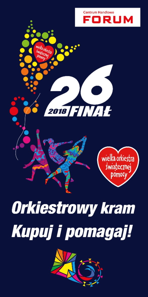 Orkiestrowy Kram w CH FORUM działać będzie w dniu finału Orkiestry, tj. w niedzielę 14 stycznia, od godz. 12:00 do 18:00. Klienci znajdą go na 1. piętrze, w okolicy restauracji KFC i McDonald’s. Każdy będzie mógł na nim kupić coś dla siebie i w ten sposób wesprzeć WOŚP, gdyż wszystkie pieniądze ze zbycia fantów trafią do specjalnej orkiestrowej mega-puszki. Sprzedawane przedmioty pochodzą z zasobów własnych CH FORUM, lub też zostały przekazane przez Sztab Orkiestry oraz najemców tego centrum.