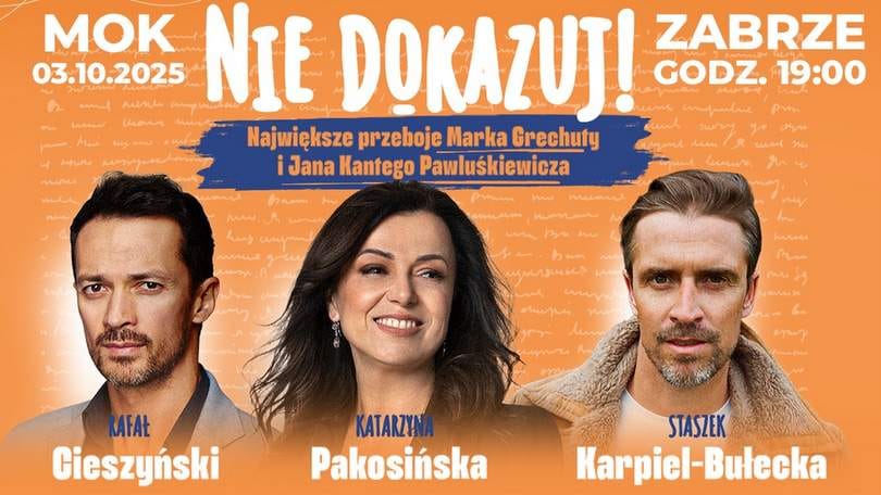 Muzyczne widowisko pełne wspomnień, uśmiechu i dobrego humoru – “Nie dokazuj! Największe przeboje Marka Grechuty i Jana Kantego Pawluśkiewicza” to wydarzenie, które w piątek, 3 października odbędzie się w Miejskim Ośrodku Kultury w Zabrzu. Bilety są już w sprzedaży.