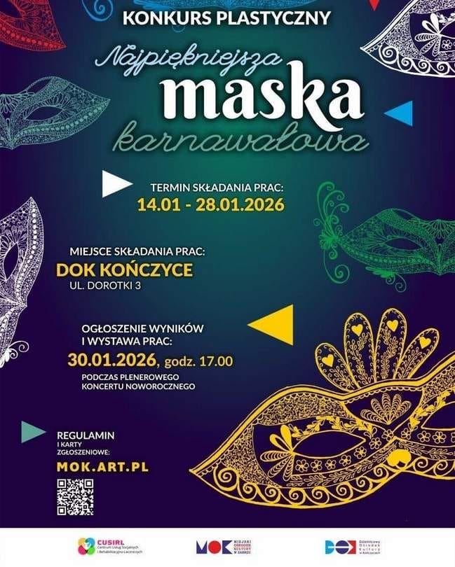 3. Dostarczenie osobiście lub przesłanie wykonanej przez siebie maski karnawałowej do DOK Kończyce (Zabrze, ul. Dorotki 3) do 4 lutego (termin wydłużono)