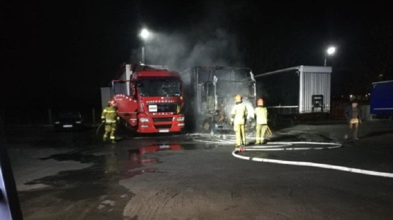 Przy ulicy Składowej paliły się dwa samochody ciężarowe, a konkretniej – ciągniki siodłowe tych pojazdów. Pożar udało się ugasić zanim płomienie przeniosły się na podpięte do nich naczepy.