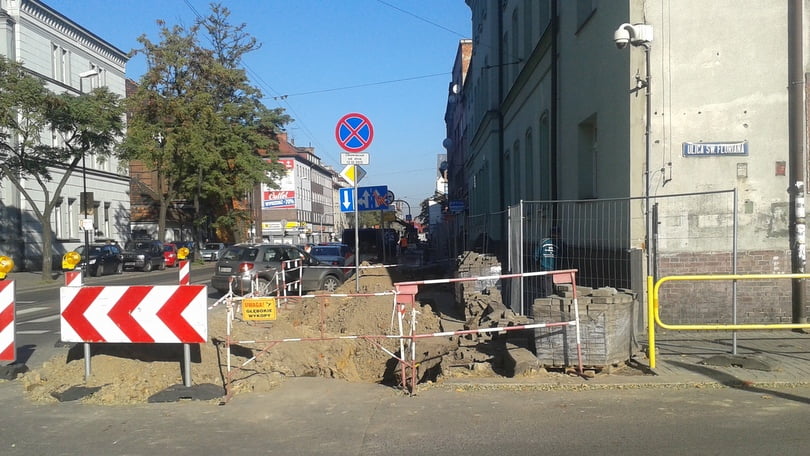 Prace ziemne przy ulicy 3 Maja i św. Floriana28 października 2015 Teren przy Miejskim Ośrodku Pomocy Rodzinie zamienił się w wielki plac budowy. Petenci muszą liczyć się z utrudnieniami. Łatwo nie mają również kierowcy, bo przecznicę dalej remontowane jest torowisko tramwajowe.