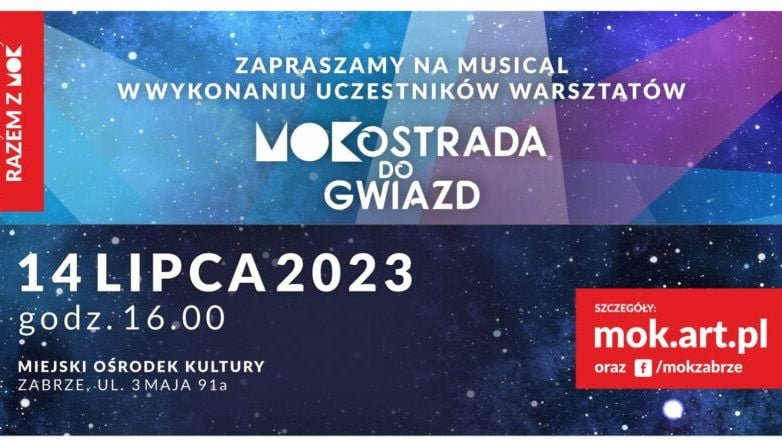 „MOKostrada do gwiazd” to wakacyjne warsztaty musicalowe, które odbywały się w MOK-u przez dziesięć dni. Dla uczestników to muzyczna przygoda w iście Broadwayowskim stylu – zajęcia inspirowane wielkimi scenami świata. Warsztaty realizowane były według programu w oparciu o autorski scenariusz musicalu „W 80 Dni Dookoła Świata”. Podczas zajęć uczestnicy mieli okazję nie tylko nauczyć się wielu nowych piosenek, lecz także stworzyć własny utwór, który zaprezentują podczas pokazu finałowego.