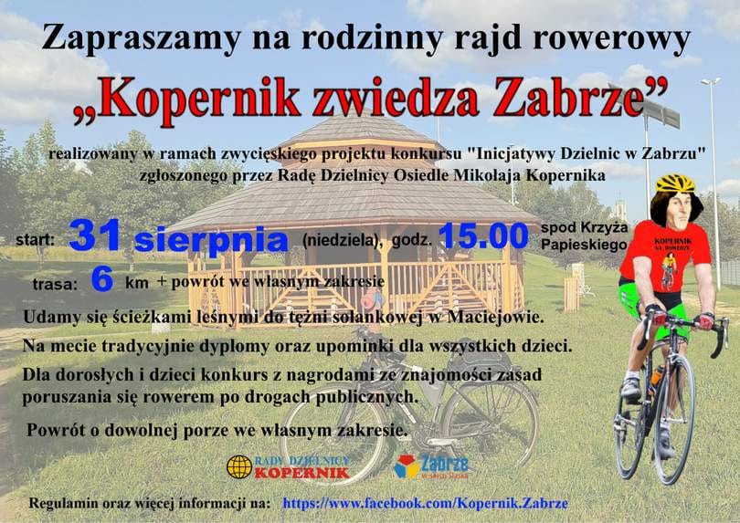 Rajd rowerowy “Kopernik zwiedza Zabrze” organizowany jest w ramach zwycięskiego projektu w konkursie “Inicjatywy Dzielnic w Zabrzu”, który zgłoszony został przez Radę Dzielnicy Osiedle Mikołaja Kopernika.