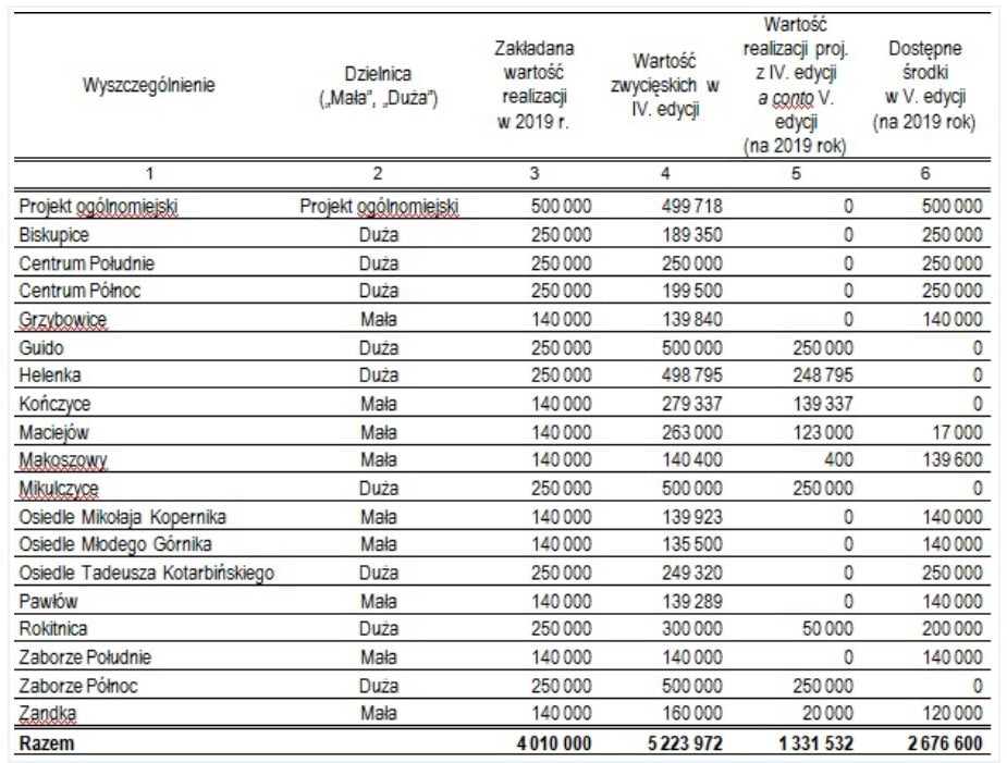 Z każdym miesiącem przybywa zrealizowanych w ramach budżetu obywatelskiego projektów, a kolejne wchodzą w ostatnią fazę wykonania. Dotychczas w Zabrzu (z wszystkich edycji) wykonano już 39 projektów. Kolejne projekty są kończone. Zgodnie z oczekiwaniami mieszkańców powstają m.in. nowe boiska piłkarskie, siłownie pod chmurką, place zabaw, parkingi, montowane są też lampy oświetleniowe wzdłuż chodników i alejek ogrodowych.
