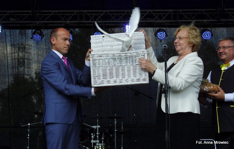 Samorządowo-ministerialny gołąbek pokoju7 września 2015 Prezydent Zabrza, Małgorzata Mańka-Szulik i minister sprawiedliwości, Borys Budka podczas dorocznych miejskich dożynek w Grzybowicach.