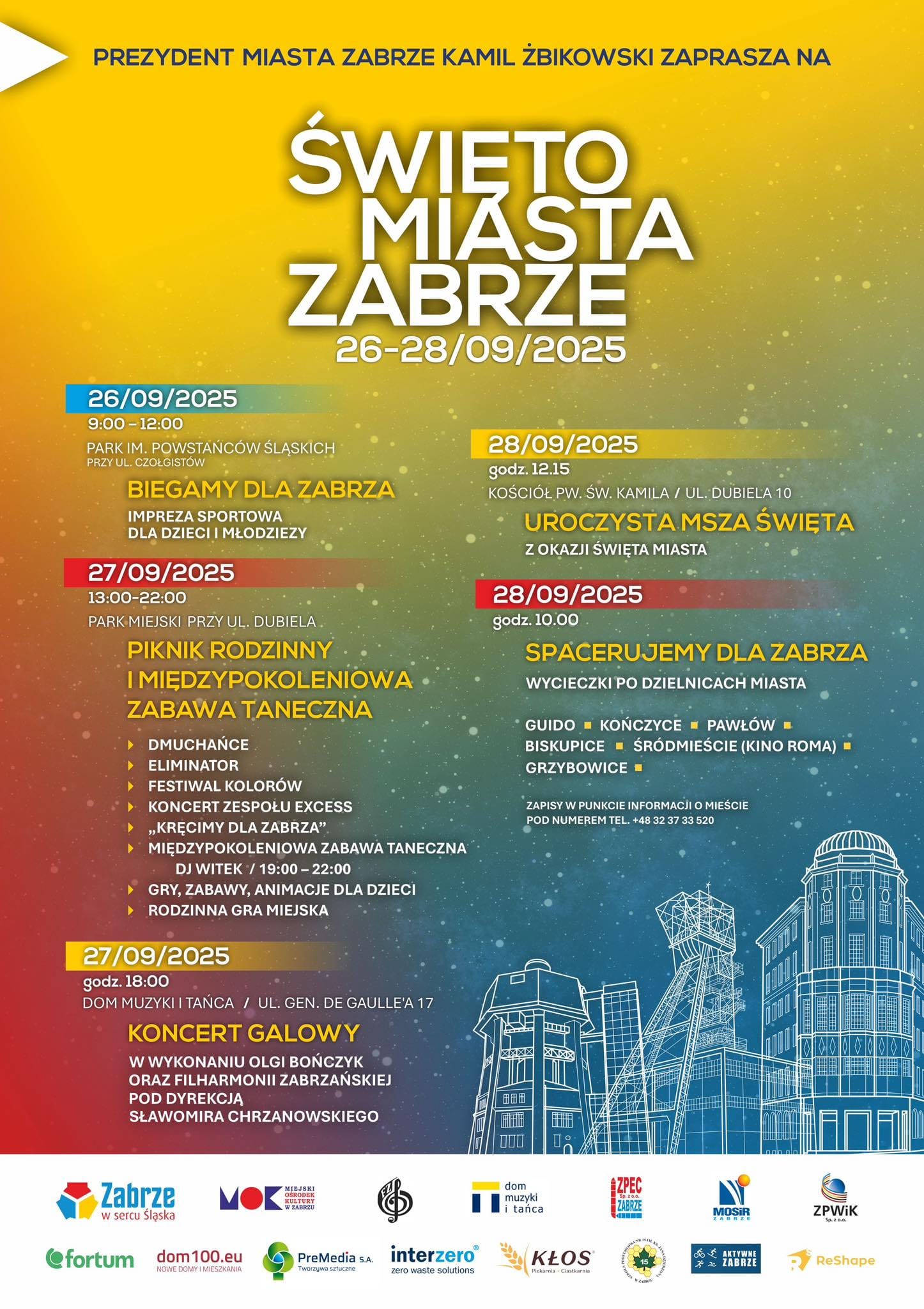 Święto Zabrza rozpocznie się w piątek, 26 września. Tego dnia w Parku im. Powstańców Śląskich przy ul. Czołgistów, w godzinach od 9:00 do 12:00 odbędzie się impreza sportowa dla dzieci i młodzieży pod hasłem “Biegamy dla Zabrza”. Miasto zaprasza do zapisów szkoły podstawowe – szczegółowe informacje znajdują się tu: https://aktywnezabrze.pl/biegamy-dal-zabrza/.