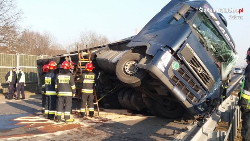 Kierujący ciężarówką jadąc w stronę Gliwic, z nieustalonych przyczyn doprowadził do przewrócenia pojazdu na jezdnię. W wyniku zdarzenia przez 9 godzin DTŚ była zamknięta dla ruchu. Badanie na obecność alkoholu wykazały, że kierujący był trzeźwy, ale w jego organizmie ujawniono obecność amfetaminy.