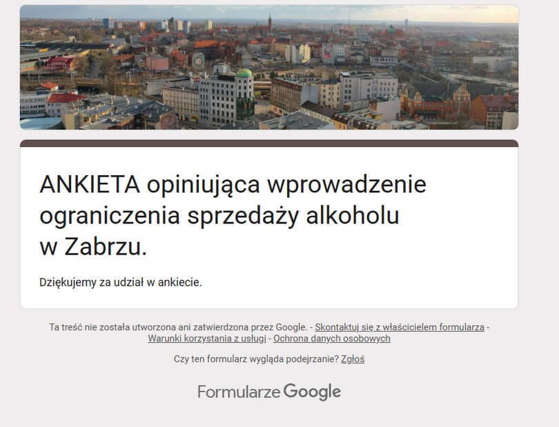 ANKIETA opiniująca wprowadzenie ograniczenia sprzedaży alkoholu Zabrzu została wykonana w formularzu google. Jak zaznaczono na wstępie, ograniczenie, którego dotyczy zapytanie, nie dotyczy np. pubów, restauracji, kawiarni oraz wszelkich lokali gastronomicznych.