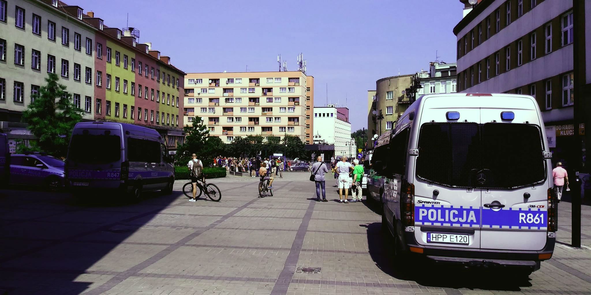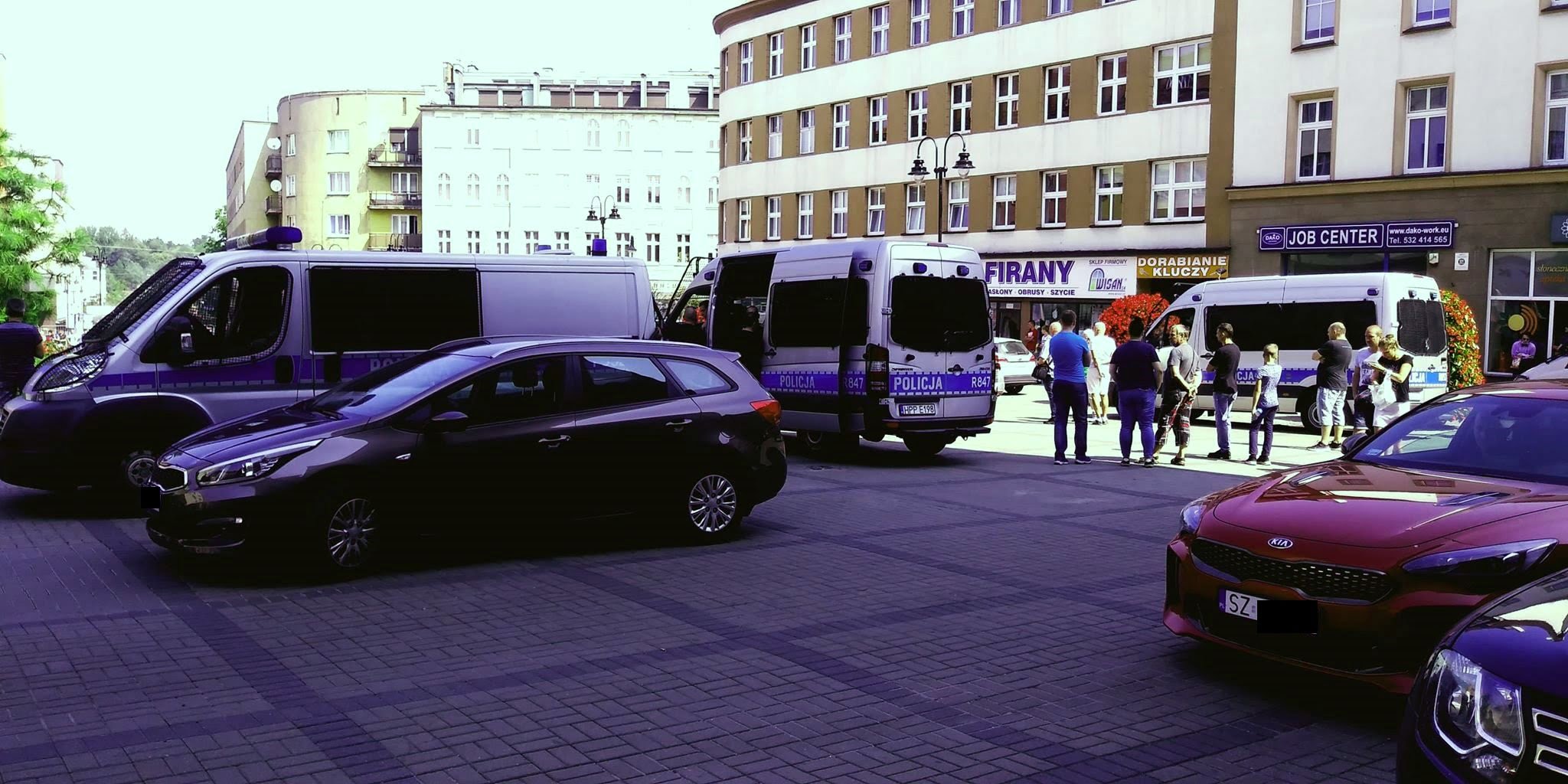 W okolicznych uliczkach oraz na samym placu Wolności przebywało kilkanaście policyjnych samochodów, głównie furgonów.