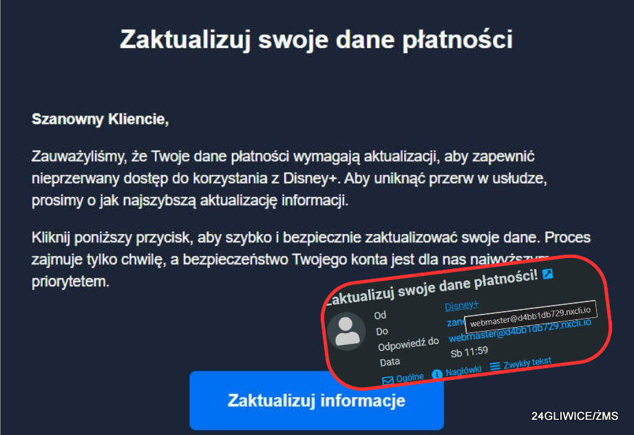 Jeśli nie posiadacie konta w serwisie Disney+ to zapewne wiadomość, że nie dokonaliście wpłaty i dostęp zostanie zablokowany co najwyżej Was zdziwi. Wysyłany masowo spam może jednak trafić do kogoś, kto takie konto posiada i, jeśli nie zachowa ostrożności, kliknie w zawarty w mailu kafelek służący “aktualizacji informacji”, tym sposobem dając oszustom dostęp np. do swoich danych logowania się do banku. To rzecz jasna przykład, bo tego rodzaju wiadomości e-mail mogą dotyczyć wszystkich serwisów streamingowych, jak chociażby NETFLIX, AMAZON PRIME VIDEO, czy HBO MAX.