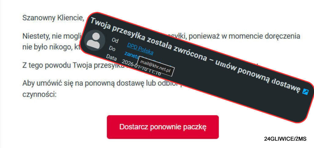 Są także rzekome wiadomości od firm kurierskich, na przykład o zwróceniu paczki – a nóż (i widelec) trafią na kogoś, kto akurat na przesyłkę czeka. Znów pole do kliknięcia, a dalej przypuszczalnie dane do wypełnienia i do… wyłudzenia.