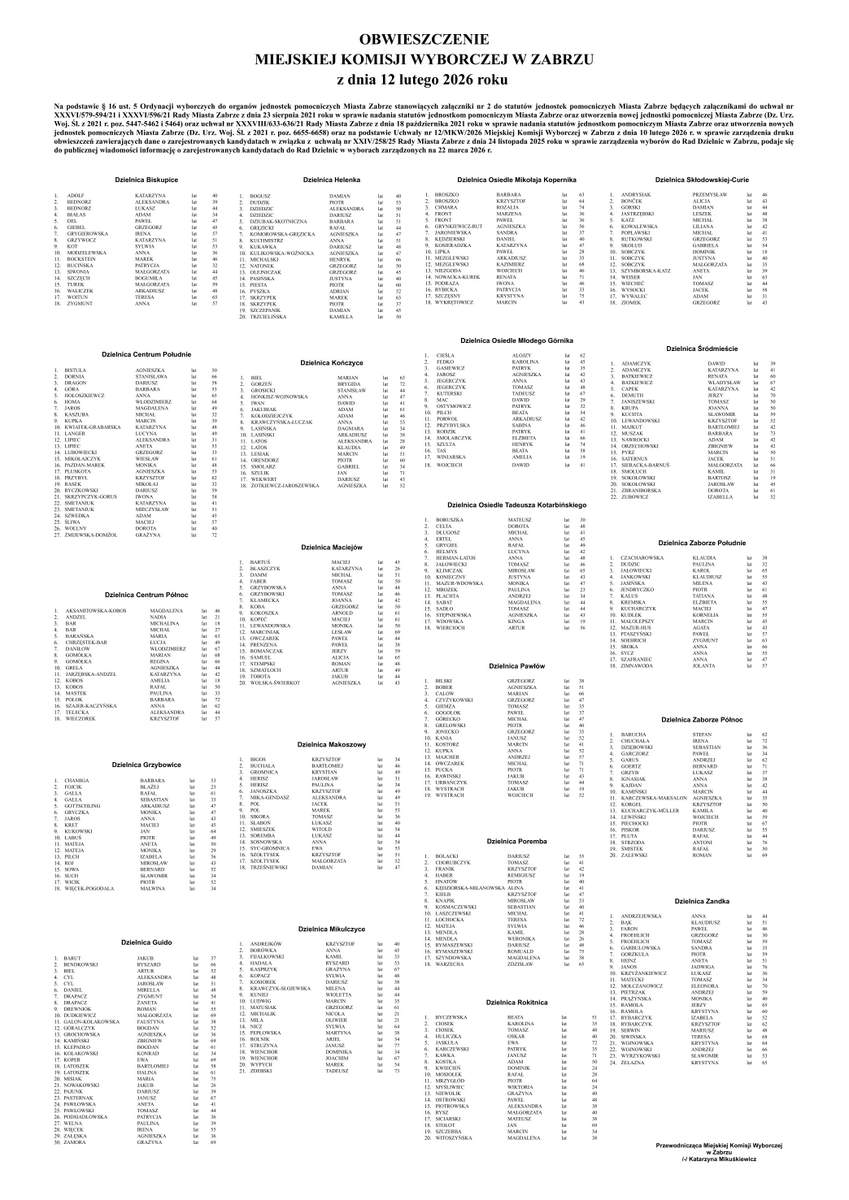 Listy kandydatów w poszczególnych dzielnicach zostały opublikowane na stronie internetowej Urzędu Miejskiego w Zabrzu oraz na obwieszczeniach dostępnych na terenie dzielnic. W formacie PDF można je też pobrać tu: KANDYDACI_DO_RAD_2026_OBWIESZCZENIE_11_02