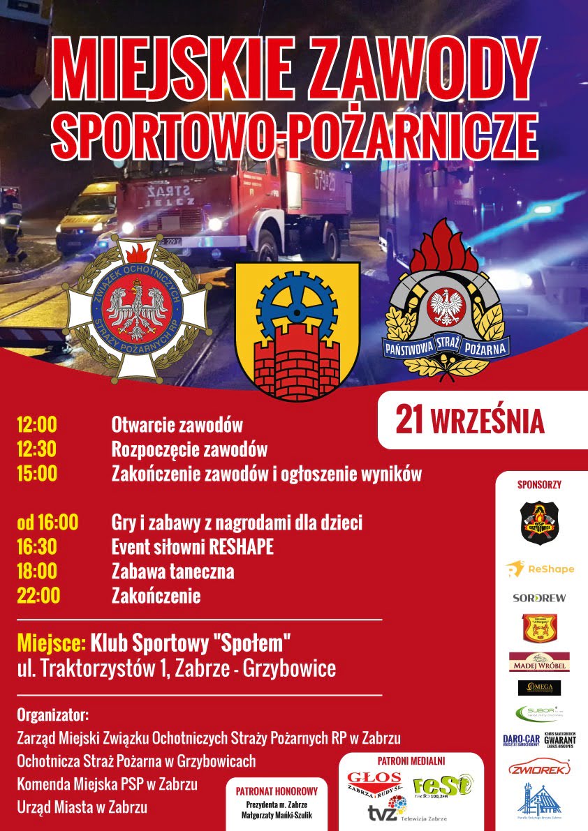 Miejskie Zawody Sportowo-Pożarnicze Ochotniczych Straży Pożarnych Miasta Zabrze oraz Festyn Strażacki odbędą się w sobotę, 21 września. Konkurencje rozpoczną się o godzinie 12:00 na boisku sportowym KS Społem w Grzybowicach (ul. Traktorzystów 1).